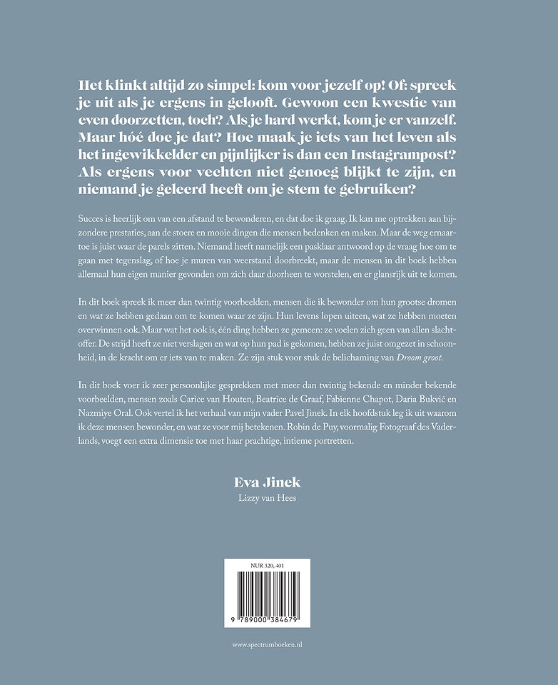 In dit boek spreek ik meer dan twintig voorbeelden, mensen die ik bewonder om hun grootse dromen en wat ze hebben gedaan om te komen waar ze zijn. Hun levens lopen uiteen, wat ze hebben moeten overwinnen ook. Maar wat het ook is, één ding hebben ze gemeen: ze voelen zich geen van allen slachtoffer. De strijd heeft ze niet verslagen en wat op hun pad is gekomen, hebben ze juist omgezet in schoonheid, in de kracht om er iets van te maken. Ze zijn stuk voor stuk de belichaming van Droom groot.