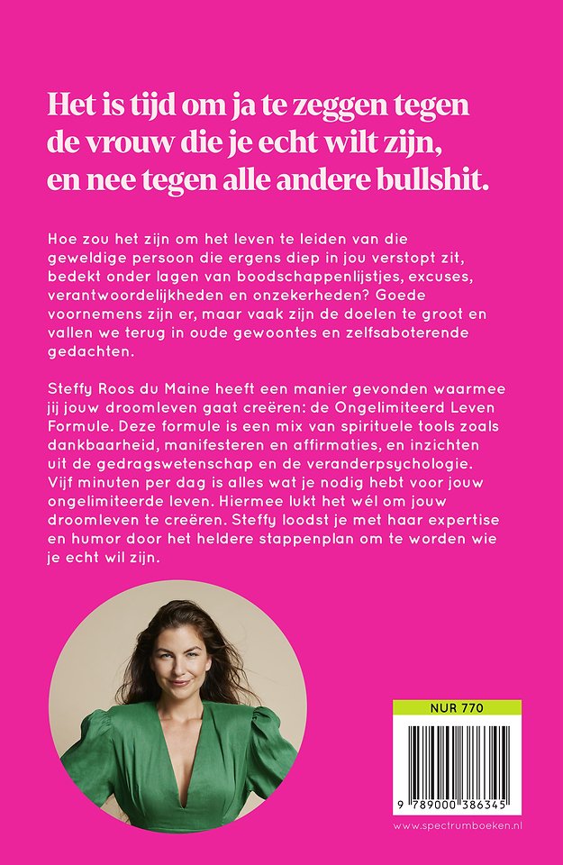 Steffy Roos du Maine heeft een manier gevonden waarmee jij jouw droomleven gaat creëren: de Ongelimiteerd Leven Formule. Deze formule is een mix van spirituele tools zoals dankbaarheid, manifesteren en affirmaties, en inzichten uit de gedragswetenschap en de veranderpsychologie. Vijf minuten per dag is alles wat je nodig hebt voor jouw ongelimiteerde leven. Hiermee lukt het wél om jouw droomleven te creëren. Steffy loodst je met haar expertise en humor door het heldere stappenplan om te worden wie je echt wil zijn.