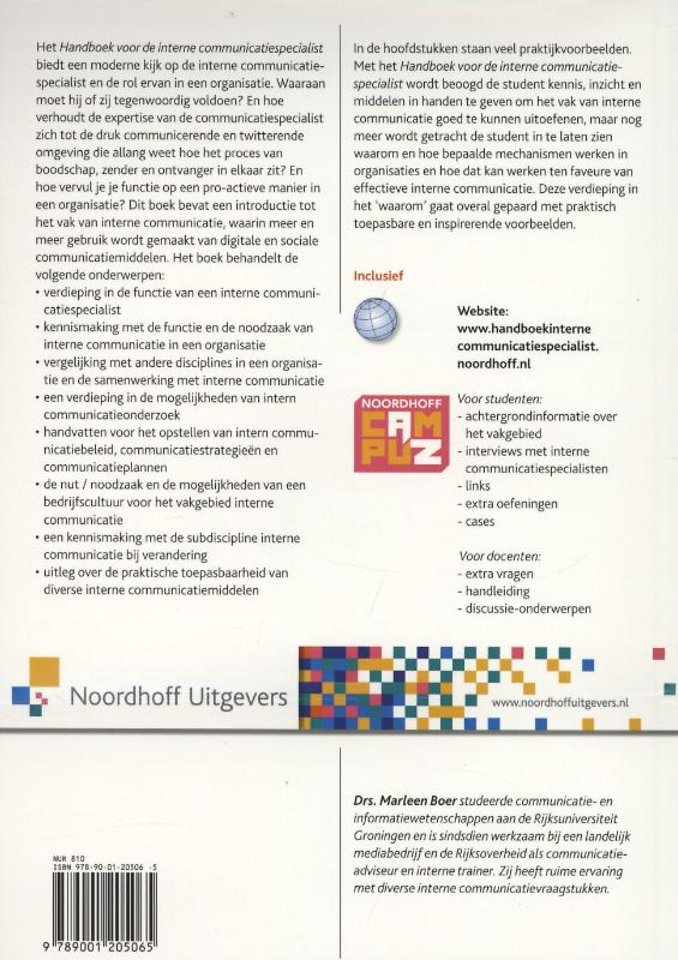 Deze uitgave geeft studenten middelen in handen om de functie van interne communicatiespecialist goed uit te kunnen oefenen. Daarbij wordt inzicht gegeven in de werking van bepaalde mechanismen in organisaties en hoe deze in het voordeel kunnen werken van een effectieve interne communicatie. Het boek is gelardeerd met vele praktisch toepasbare en inspirerende voorbeelden.