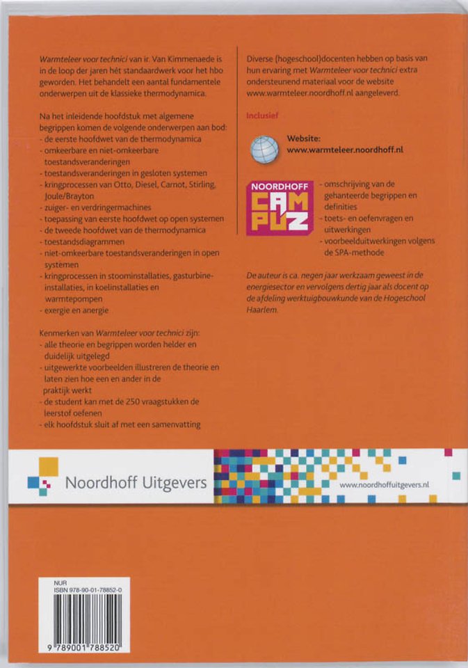 'Warmteleer voor technici' van Van Kimmenaede is in de loop der jaren hét standaardwerk voor het hbo geworden. Het behandelt een aantal fundamentele onderwerpen uit de klassieke thermodynamica. In samenwerking met diverse hbo-docenten is het boek uitgebreid met extra ondersteunend materiaal w.o. toetsvragen.