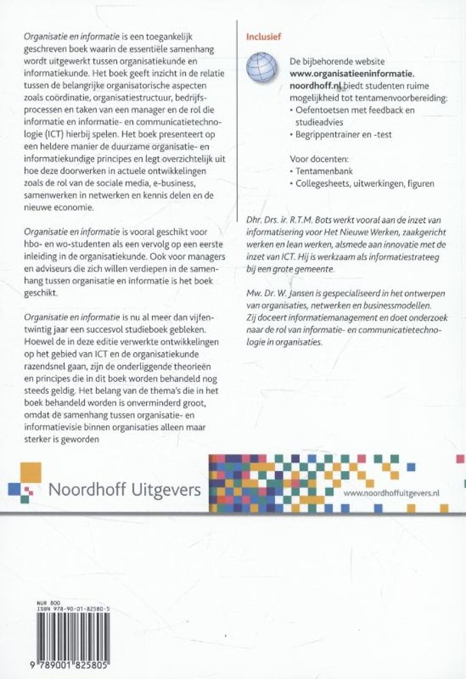 'Organisatie en informatie' is een toegankelijk geschreven boek voor studenten op een Hbo-instelling en de eerste jaren van een universitaire opleiding. In het boek worden de essentiële samenhangen uitgewerkt tussen de algemene organisatiekundige en informatiekundige beginselen. Na het bestuderen van 'Organisatie en informatie' heeft de student inzicht in de relatie tussen de belangrijke organisatorische aspecten zoals coördinatie, organisatiestructuur, bedrijfsprocessen, taken van een manager en de rol die informatie en informatie- en communicatietechnologie (ICT) hierbij spelen. In dit boek is een balans gevonden tussen enerzijds de duurzame organisatiekundige en informatiekundige principes en anderzijds de doorwerking hiervan in actuele ontwikkelingen, zoals e-business, de netwerkeconomie en de elektronische overheid.