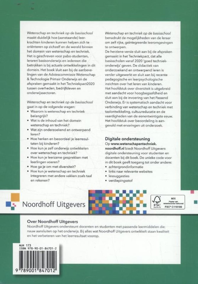 'Wetenschap en techniek op de basisschool' is geschreven voor de pabo, de master Leren & Innoveren, de master Special Educational Needs, post-hbo-trajecten voor Techniekcoördinator en nascholingscursussen voor leerkrachten in het basisonderwijs. Het boek sluit aan bij de aanbevelingen van de Adviescommissie Wetenschap & Technologie Primair Onderwijs en de afspraken die zijn gemaakt in het Techniekpact2020 tussen overheden, bedrijfsleven en onderwijssectoren.