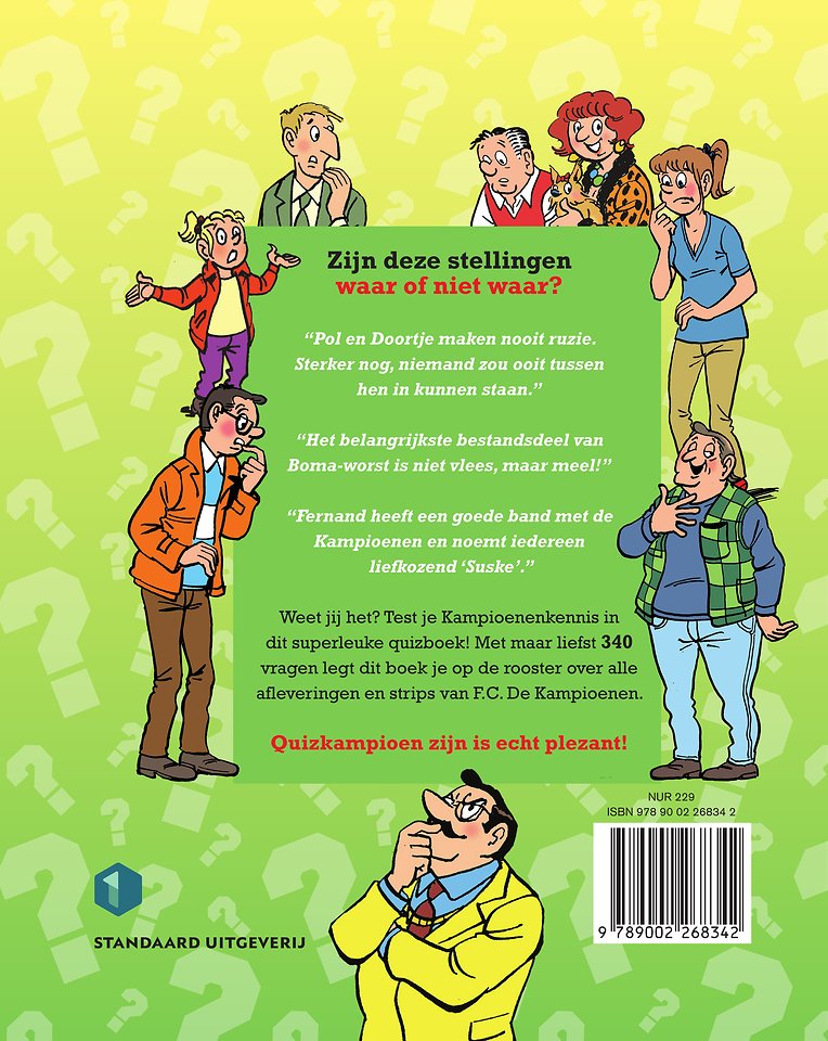 Zijn deze stellingen waar of niet waar?“Pol en Doortje maken nooit ruzie. Sterker nog, niemand zou ooit tussen hen in kunnen staan.”“Het belangrijkste bestandsdeel van Boma-worst is niet vlees, maar meel!”“Fernand heeft een goede band met de Kampioenen en noemt iedereen liefkozend ‘Suske’.”Weet jij het? Test je Kampioenenkennis in dit superleuke quizboek! Met maar liefst 340 vragen legt dit boek je op de rooster over alle afleveringen en strips van F.C. De Kampioenen.Quizkampioen zijn is echt plezant!