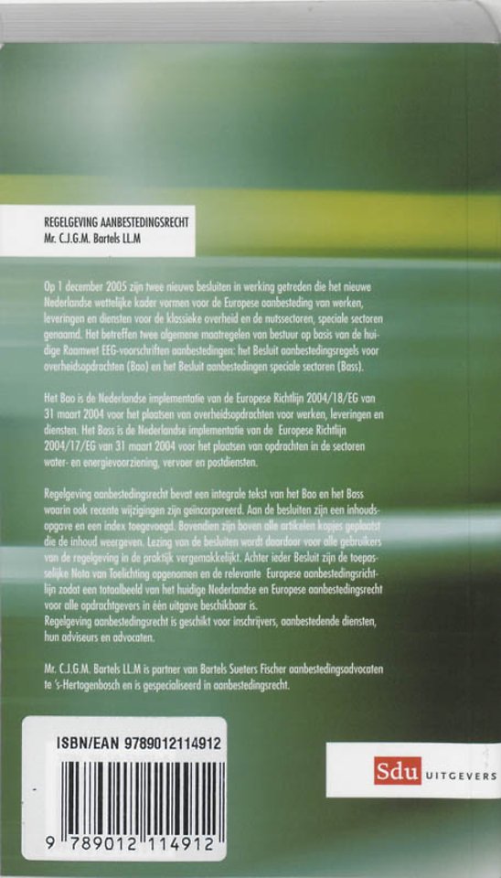 Regelgeving aanbestedingsrecht bevat een integrale tekst van het Bao en het Bass waarin ook recente wijzigingen zijn geïncorporeerd. Aan het besluiten zijn een inhoudsopgave en een index toegevoegd. Bovendien zijn boven alle artikelen kopjes geplaatst die de inhoud weergeven. Lezing van de besluiten wordt daardoor voor alle gebruikers van de regelgeving in de praktijk vergemakkelijkt. Achter ieder Besluit zijn de toepasselijke Nota van Toelichting opgenomen en de relevante Europese aanbestedingsrichtlijn zodat een totaalbeeld van het huidige Nederlandse en Europese aanbestedingsrecht voor alle opdrachtgevers in één uitgave beschikbaar is. Regelgeving aanbestedingsrecht is geschikt voor inschrijvers, aanbestedende diensten, hun adviseurs en advocaten.