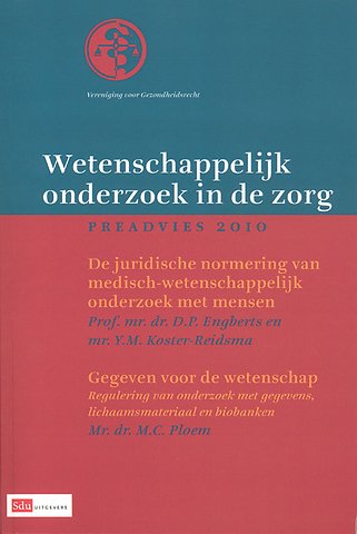 De discussie over de juridische aspecten van wetenschappelijk onderzoek met gegevens, lichaamsmateriaal en biobanken staat sterk in het teken van privacy. Deze discussie is in een ander licht komen te staan door de steeds verdergaande mogelijkheden om gegevens elektronisch op te slaan en te verspreiden. Specifieke vragen worden opgeroepen door de komst van de zogenoemde biobanken, waarin gegevens of lichaamsmateriaal voor toekomstig onderzoek worden opgeslagen. In dit deel van het preadvies laat mr. dr. M.C. Ploem zien dat van een samenhangend en uitgekristalliseerd wettelijk kader nog onvoldoende sprake is. Een van de suggesties die zij doet, is om de Wet medisch-wetenschappelijk onderzoek met mensen (WMO) te verbreden tot al het medisch-wetenschappelijk onderzoek.