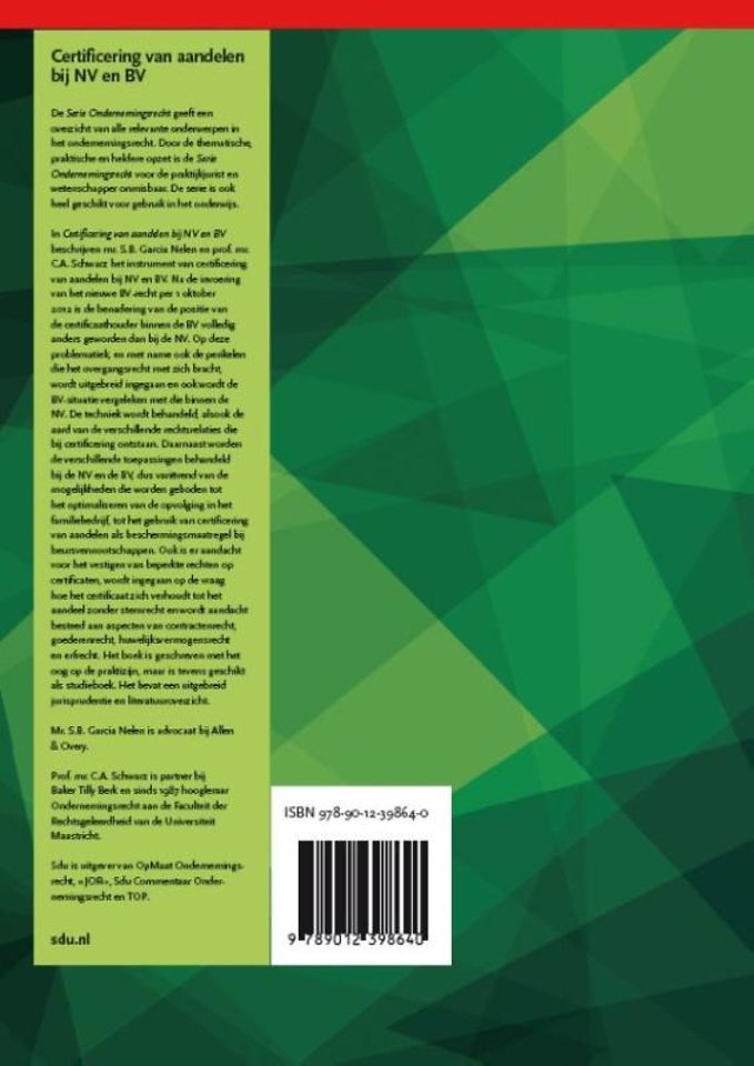 In Certificering van aandelen bij NV en BV beschrijven mr. S.B. Garcia Nelen en prof. mr. C.A. Schwarz het instrument van certificering van aandelen bij NV en BV. Na de invoering van het nieuwe BV-recht per 1 oktober 2012 is de benadering van de positie van de certificaathouder binnen de BV volledig anders geworden dan bij de NV. Op deze problematiek, en met name ook de perikelen die het overgangsrecht met zich bracht, wordt uitgebreid ingegaan en ook wordt de BV-situatie vergeleken met die binnen de NV. De techniek wordt behandeld, alsook de aard van de verschillende rechtsrelaties die bij certificering ontstaan.