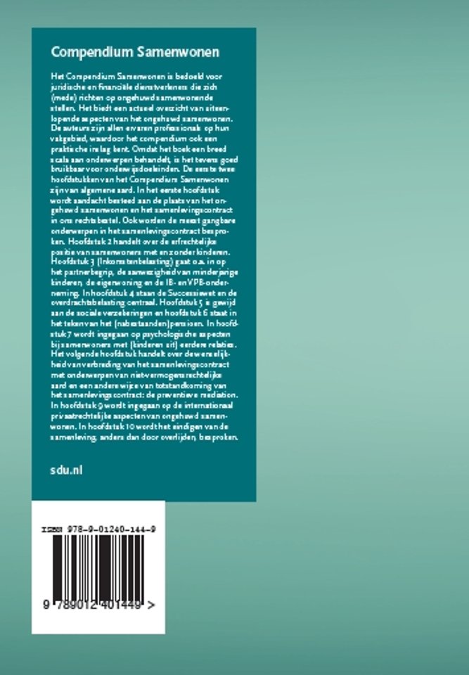Het Compendium Samenwonen is bedoeld voor juridische en financiële dienstverleners die zich (mede) richten op ongehuwd samenwonende stellen. Het biedt een actueel overzicht van uiteenlopende aspecten van het ongehuwd samenwonen. De auteurs zijn allen ervaren professionals op hun vakgebied, waardoor het compendium ook een praktische inslag kent. Omdat het boek een breed scala aan onderwerpen behandelt, is het tevens goed bruikbaar voor onderwijsdoeleinden.