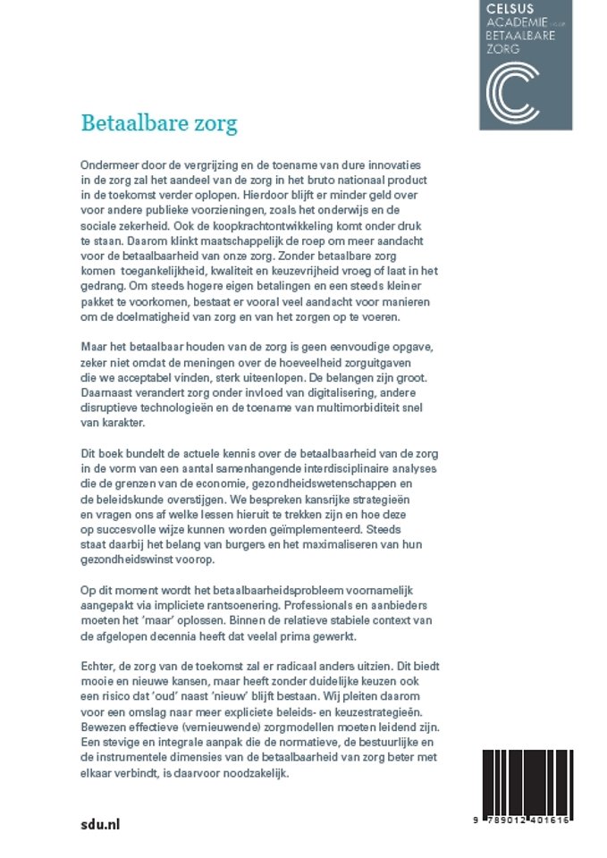 Dit boek bundelt de actuele kennis over de betaalbaarheid van de zorg in de vorm van een aantal samenhangende interdisciplinaire analyses die de grenzen van de economie, gezondheidswetenschappen en de beleidskunde overstijgen. We bespreken kansrijke strategieën en vragen ons af welke lessen hieruit te trekken zijn en hoe deze op succesvolle wijze kunnen worden geïmplementeerd. Steeds staat daarbij het belang van burgers en het maximaliseren van hun gezondheidswinst voorop.