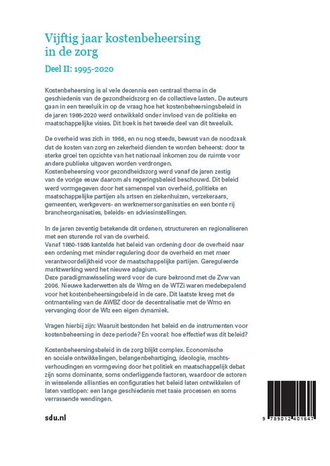 Kostenbeheersing is al vele decennia een centraal thema in de geschiedenis van de gezondheidszorg en de collectieve lasten. De auteurs gaan in een tweeluik in op de vraag hoe het kostenbeheersingsbeleid in de jaren 1966-2020 werd ontwikkeld onder invloed van de politieke en maatschappelijke visies. Dit boek is het tweede deel van dit tweeluik.