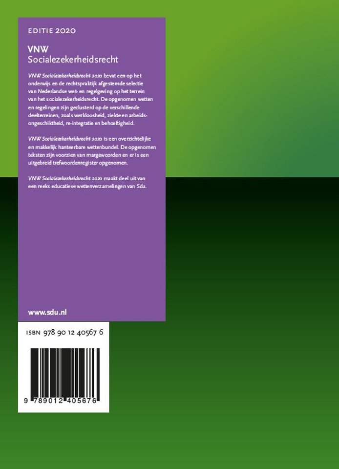 'VNW Socialezekerheidsrecht 2020' bevat een op het onderwijs en de rechtspraktijk afgestemde selectie van Nederlandse wet- en regelgeving op het terrein van het socialezekerheidsrecht. De opgenomen wetten en regelingen zijn geclusterd op de verschillende deelterreinen, zoals werkloosheid, ziekte en arbeidsongeschiktheid, re-integratie en behoeftigheid.