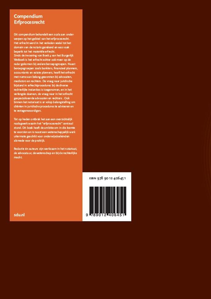 Tot op heden ontbrak het aan een overzichtelijk naslagwerk waarin het erfprocesrecht centraal stond. Dit boek heeft de ambitie om in die leemte te voorzien en is naast wetenschappelijk werk uitermate geschikt voor onderwijsdoeleinden alsmede voor de praktijk. Redactie én auteurs zijn werkzaam in het notariaat, de advocatuur, de wetenschap en bij de rechterlijke macht.