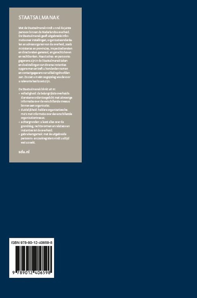 Met de Staatsalmanak vindt u snel de juiste persoon binnen de Nederlandse overheid. Naast adres- en persoonsgegevens zijn in de Staatsalmanak taken en doelstellingen van diverse instanties opgenomen en treft u honderden namen en contactgegevens van afdelingshoofden aan. Zo ziet u in één oogopslag wie de voor u relevante beslissers zijn.