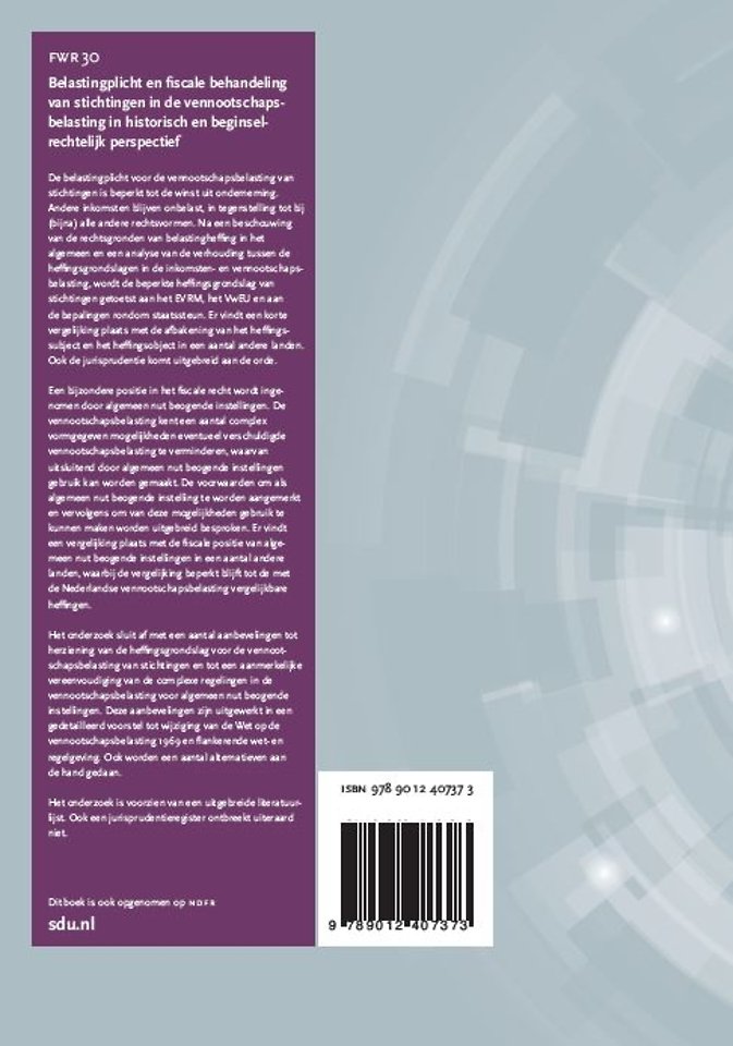 De belastingplicht voor de vennootschapsbelasting van stichtingen is beperkt tot de winst uit onderneming. Andere inkomsten blijven onbelast, in tegenstelling tot bij (bijna) alle andere rechtsvormen. Na een beschouwing van de rechtsgronden van belastingheffing in het algemeen en een analyse van de verhouding tussen de heffingsgrondslagen in de inkomsten- en vennootschapsbelasting, wordt de beperkte heffingsgrondslag van stichtingen getoetst aan het EVRM, het VwEU en aan de bepalingen rondom staatssteun. Er vindt een korte vergelijking plaats met de afbakening van het heffingssubject en het heffingsobject in een aantal andere landen. Ook de jurisprudentie komt uitgebreid aan de orde.