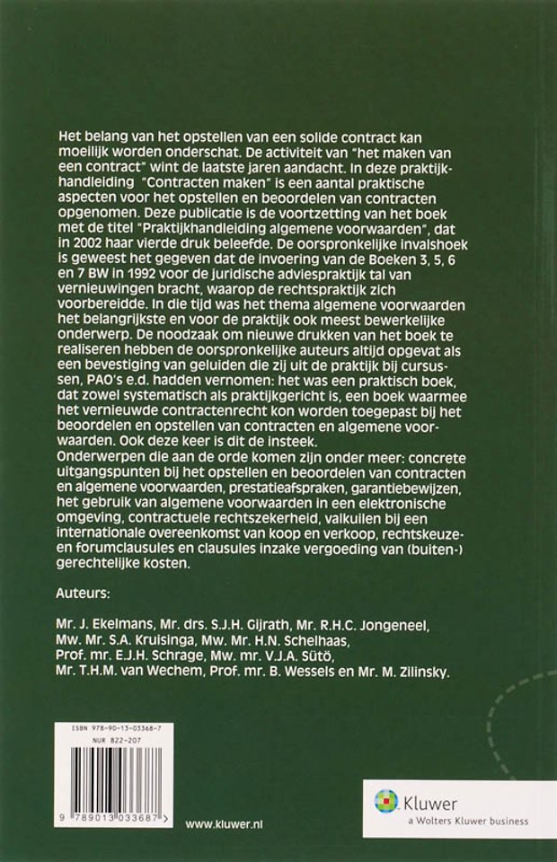 Deze publicatie 'Contracten maken' is de voortzetting van het boek met de titel 'Praktijkhandleiding algemene voorwaarden', dat sedert 1992 op de markt is en in 2002 zijn vierde druk beleefde. De oorspronkelijke invalshoek is geweest het gegeven dat de invoering van de Boeken 3, 5, 6 en 7 BW in 1992 voor de juridische adviespraktijk tal van vernieuwingen bracht, waarop de rechtspraktijk zich voorbereidde. In die tijd was het thema algemene voorwaarden het belangrijkste en voor de praktijk ook meest bewerkelijke onderwerp. Hoewel dat thema belangrijk blijft wint de laatste jaren de algemene aanpak van het 'maken van een contract' aan aandacht.