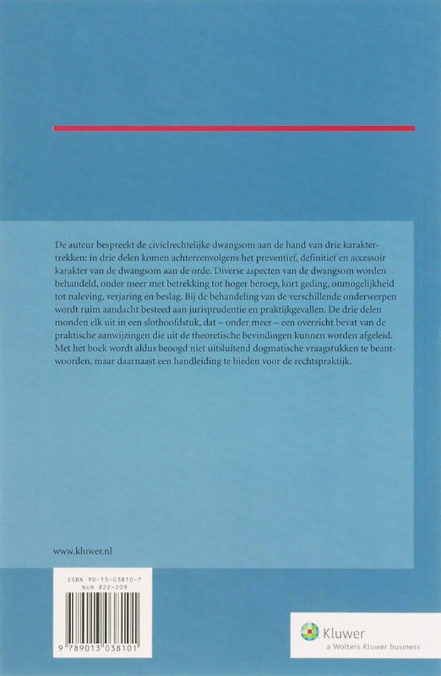 'Dwangsom' geeft het proefschrift weer van mevrouw M.B. Beekhoven van den Boezem, ter verkrijging van het doctoraat in de rechtsgeleerdheid aan de Universiteit van Groningen. De auteur bespreekt de civielrechtelijke dwangsom aan de hand van drie karaktertrekken: in drie delen komen achtereenvolgens het preventief, definitief en accessoir karakter van de dwangsom aan de orde.