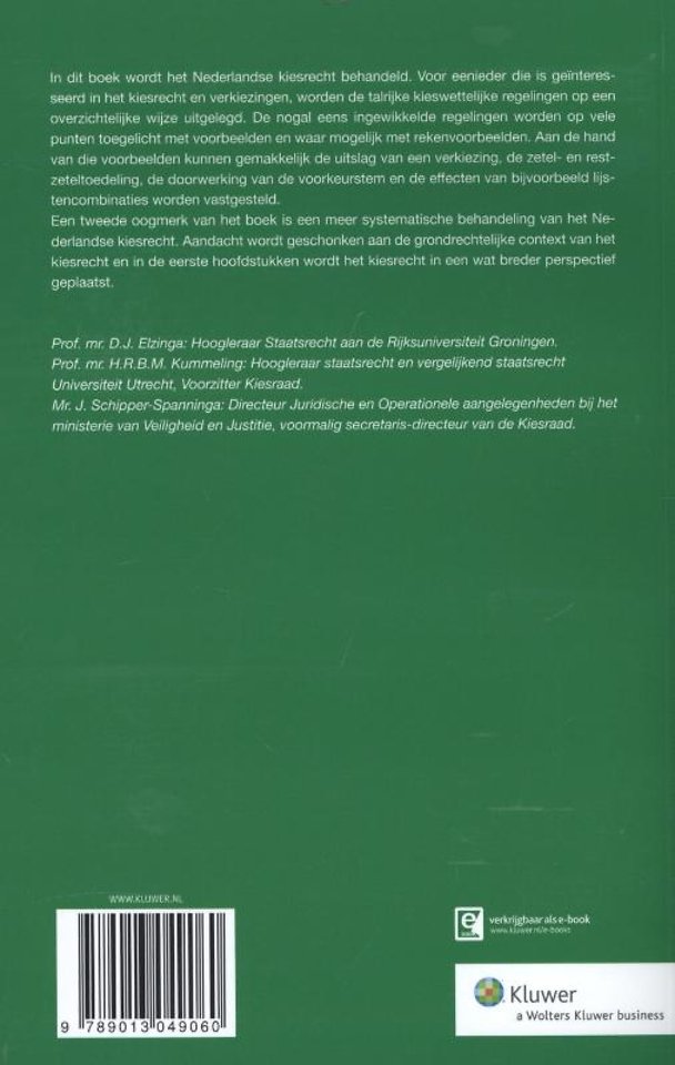 In dit boek wordt het Nederlandse kiesrecht behandeld. Voor eenieder die is geïnteresseerd in het kiesrecht en verkiezingen, worden de talrijke kieswettelijke regelingen op een overzichtelijke wijze uitgelegd. De nogal eens ingewikkelde regelingen worden op vele punten toegelicht met voorbeelden en waar mogelijk met rekenvoorbeelden. Aan de hand van die voorbeelden kunnen gemakkelijk de uitslag van een verkiezing, de zetel- en restzeteltoedeling, de doorwerking van de voorkeurstem en de effecten van bijvoorbeeld lijstencombinaties worden vastgesteld.