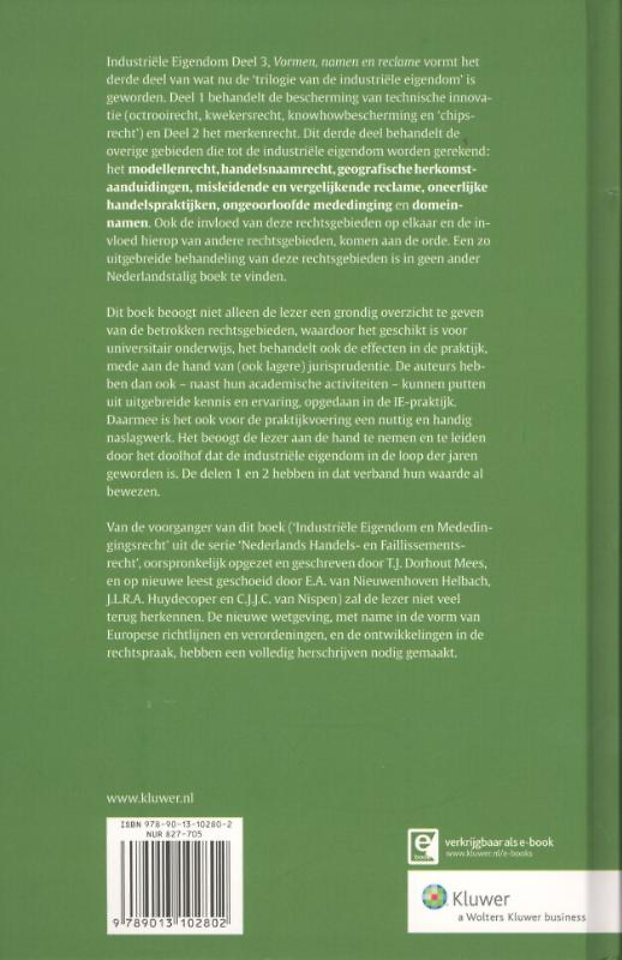 'Industriële Eigendom deel 3, vormen, namen en reclame' vormt het derde deel van wat nu de 'trilogie van de industriële eigendom' is geworden. Deel 1 behandelt de bescherming van technische innovatie (octrooirecht, kwekersrecht, know how-bescherming en 'chipsrecht') en deel 2 het merkenrecht.