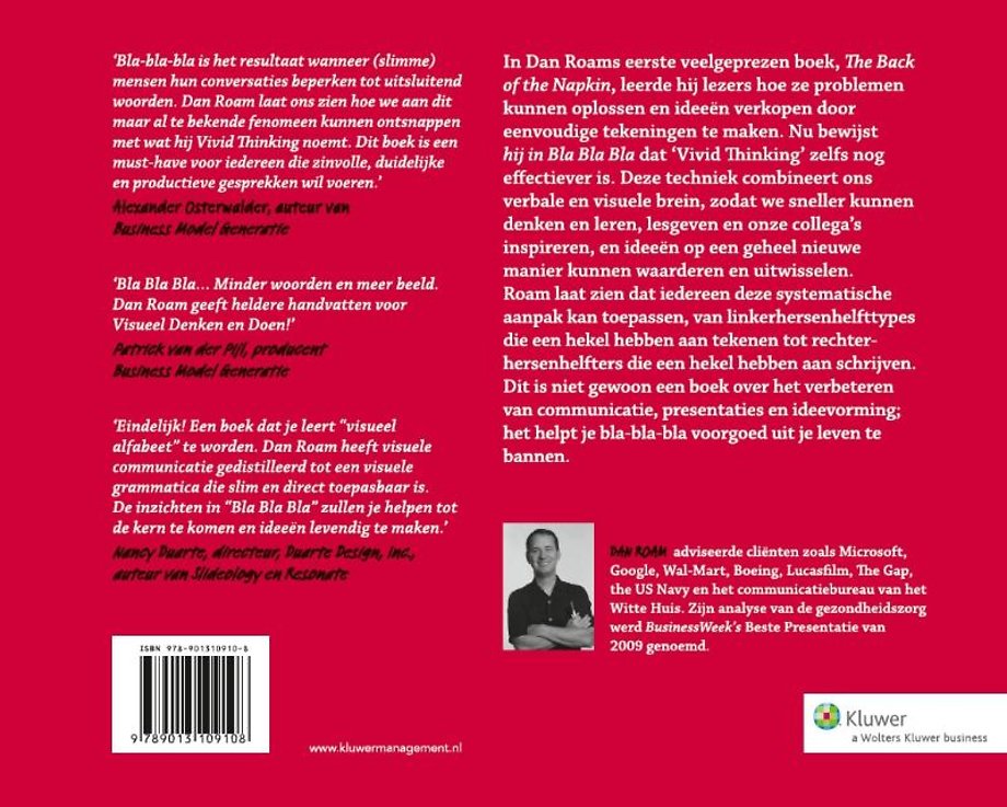 Meer over Dan RoamIn Dan Roams eerste veelgeprezen boek,'The Back of the Napkin', leerde hij lezers hoe ze problemen kunnen oplossen en ideeën verkopen door eenvoudige tekeningen te maken. Nu bewijst hij in 'Bla bla bla' dat "Vivid Thinking" zelfs nog effectiever is.