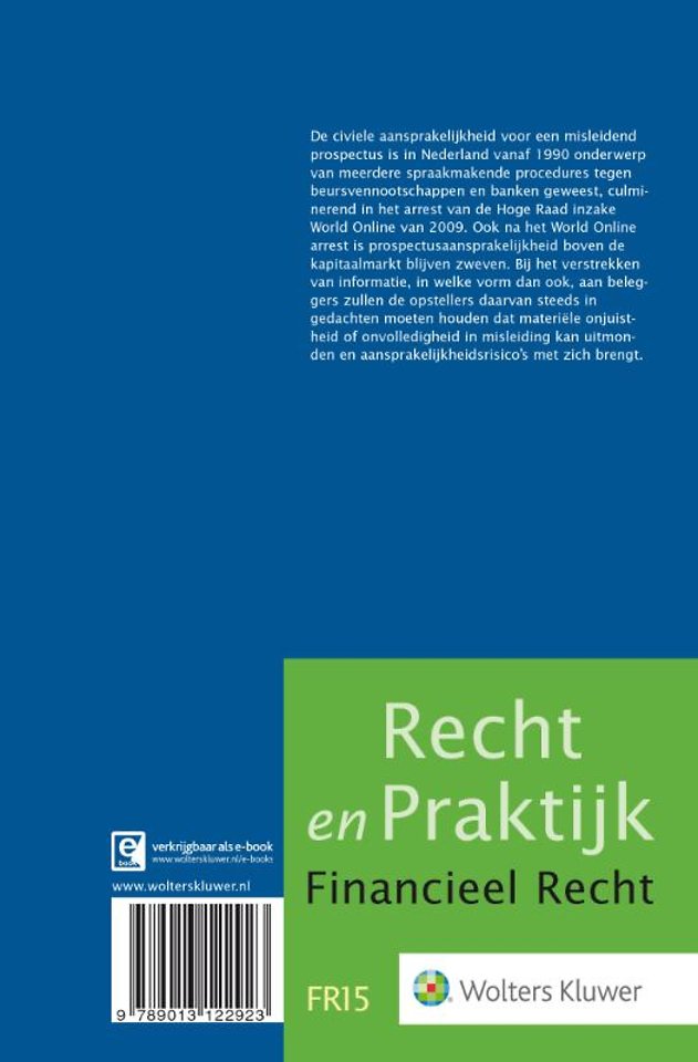 Maakt een misleidend prospectus de verstrekker ervan civiel aansprakelijk? Die kwestie vormt sinds 1990 de achtergrond van meerdere spraakmakende procedures tegen beursvennootschappen en banken. De aandacht groeit voor de gevolgen van een incorrecte opstelling van het prospectusdocument. In het bijzonder voor de aansprakelijkheidsrisico’s die daaraan vastkleven. Vanuit zijn achtergrond als praktiserend advocaat en wetenschapper is de auteur van deze uitgave erin geslaagd dit onderwerp te vertalen tot een inzichtelijk handboek, geschikt voor praktijk en wetenschap.