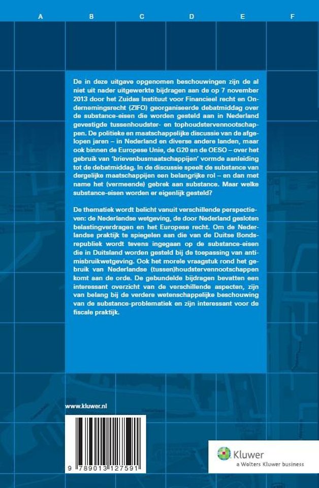 De in 'Substance en de Nederlandse houdstervennootschap' opgenomen beschouwingen zijn de al niet uit nader uitgewerkte bijdragen aan de op 7 november 2013 door het Zuidas Instituut voor Financieel recht en Ondernemingsrecht (ZIFO) georganiseerde debatmiddag over de substance-eisen die worden gesteld aan in Nederland gevestigde tussenhoudster- en tophoudstervennootschappen.