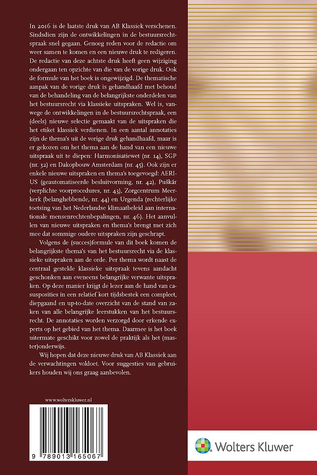 In deze geactualiseerde uitgave van AB Klassiek komen de belangrijkste thema’s van het bestuursrecht via de klassieke uitspraken aan de orde. Per thema wordt naast de centraal gestelde klassieke uitspraak ook aandacht besteed aan belangrijke verwante uitspraken. De lezer krijgt daarmee aan de hand van casusposities in een relatief kort tijdsbestek een compleet, diepgaand en up-to-date overzicht van de stand van zaken van alle belangrijke leerstukken van het bestuursrecht. De annotaties worden verzorgd door erkende experts op het gebied van het thema. Daarmee is deze titel uitermate geschikt voor zowel de praktijk als het (master)onderwijs.