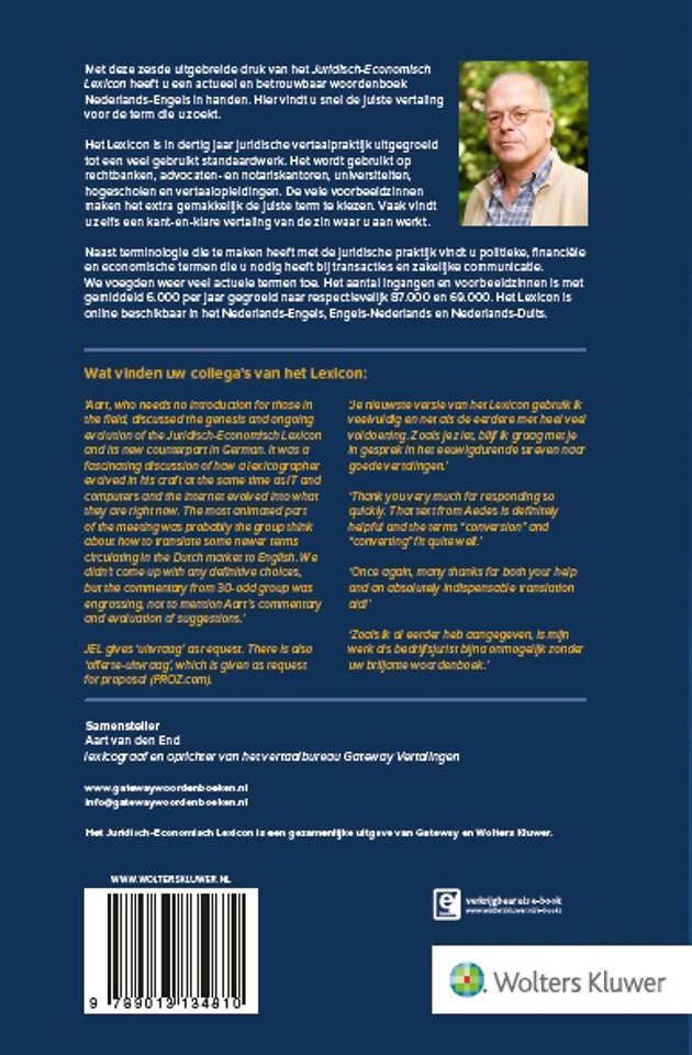Met deze zesde uitgebreide druk van het Juridisch-Economisch Lexicon NL-EN heeft u een actueel en betrouwbaar woordenboek in handen. Hier vindt u snel de juiste vertaling voor de term die u zoekt.