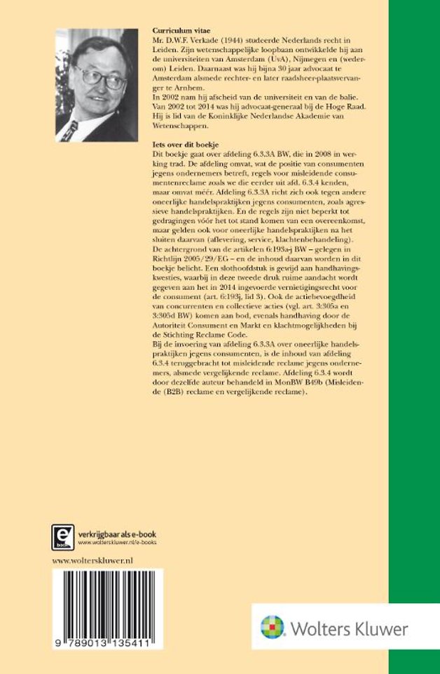 De achtergrond van de artikelen 6:193a-j BW - gelegen in Richtlijn 2005/29/EG - en de inhoud daarvan worden in dit boekje belicht. Een slothoofdstuk is gewijd aan handhavingskwesties, waarbij in deze tweede druk ruime aandacht wordt gegeven aan het in 2014 ingevoerde vernietigingsrecht voor de consument (art. 6:193j, lid 3). Ook de actiebevoegdheid van concurrenten en collectieve acties (vgl. art. 3:305a en 3:305d BW) komen aan bod, evenals handhaving door de Autoriteit Consument en Markt en klachtmogelijkheden bij de Stichting Reclame Code.