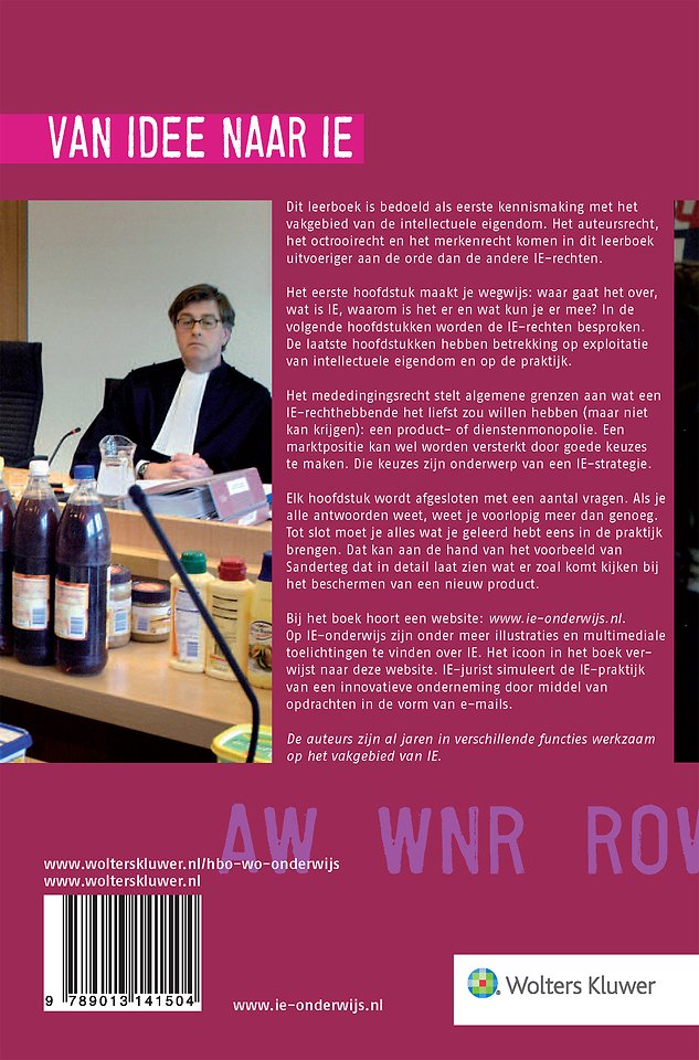 Deze uitgave vormt een eerste kennismaking met het vakgebied van de intellectuele eigendom (IE). Binnen de IE-rechten ligt de focus op het auteursrecht, het octrooirecht en het merkenrecht. De uitgave valt op door de combinatie van een wetenschappelijke ondergrond met een sterke focus op praktijk. Wat is IE? Waarom bestaat het en wat kun je er mee? In Van Idee naar IE maak je op een toegankelijke # en toch wetenschappelijk gefundeerde # wijze kennis met de IE-rechten. Er is geen andere uitgave die een soortgelijke brug slaat tussen wetenschap en praktijk.