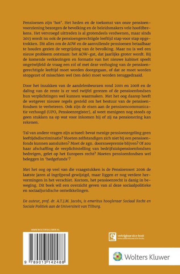 De meeste uitgaven over het pensioenrecht zijn geschreven voor fiscale specialisten, pensioenadvocaten en rechters. Deze uitgave richt zich op alle personen die betrokken zijn bij de vormgeving van pensioenrechtbeleid, zoals bestuurders van pensioenfondsen en verzekeraars, deskundigen van werkgeversorganisaties, leden van ondernemingsraden, politici en journalisten. In deze editie zijn alle nieuwe wetgeving en rechtspraak, beleidsvoornemens en ontwikkelingen in het pensioenveld meegenomen, waardoor het ook perfect geschikt is als studiemateriaal voor studenten in het hoger en wetenschappelijk onderwijs die pensioenrecht in hun pakket hebben.