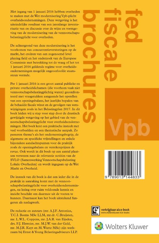 Met ingang van 1 januari 2016 hebben overheden te maken met de Wet modernisering Vpb-plicht overheidsondernemingen. Vpb-plicht bij overheidslichamen leidt u stap voor stap door de drastisch gewijzigde wetgeving. Ingewikkelde vraagstukken worden helder uitgelegd en voorzien van praktisch commentaar met veel praktijkvoorbeelden. Het ondernemingsbegrip, de algemene en specifieke vrijstellingen en aandachtspunten als de openingsbalans en verrekenprijzen passeren de revue. Op een aantal plaatsen wordt ook verwezen naar de notities van de Samenwerking Vennootschapsbelasting Lokale Overheden (SVLO) en wordt ingegaan op de Wet Markt en Overheid.