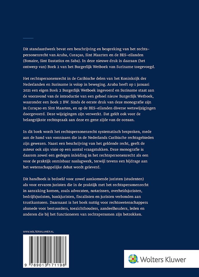 Dit standaardwerk bevat een beschrijving en bespreking van het rechtspersonenrecht van Aruba, Curaçao, Sint Maarten en de BES-eilanden (Bonaire, Sint Eustatius en Saba). In deze nieuwe druk is daaraan (het ontwerp van) Boek 2 van het Burgerlijk Wetboek van Suriname toegevoegd.