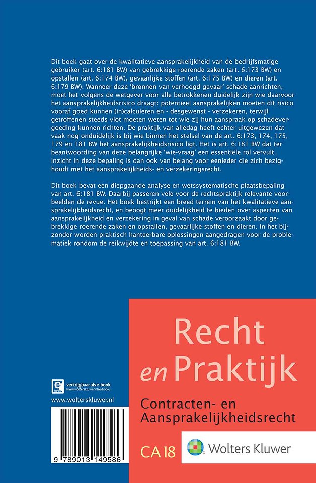 De uitgave verkent deze juridische terreinen vanuit art. 6:181 BW, dat hierin een essentiële rol speelt. Het boek biedt de lezer hiermee een steviger houvast bij het vraagstuk wie wanneer een kwalitatieve aansprakelijkheid draagt. De uitgave is daarmee onmisbaar om veel in de praktijk voorkomende aansprakelijkheidsdiscussies adequater te doorgronden en beslechten.