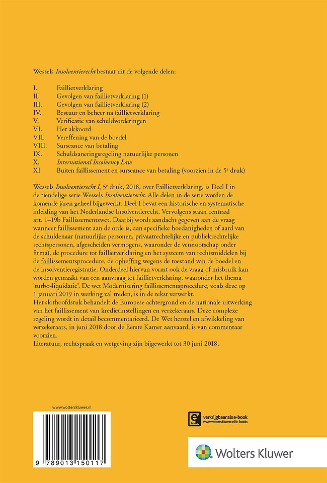 Faillietverklaring 2018 is het volledig geactualiseerde eerste deel binnen de tiendelige serie Wessels Insolventierecht. Het biedt in de eerste plaats een historische en systematische inleiding tot het Nederlandse Insolventierecht, inclusief de recente wetsontwikkelingen. Vervolgens krijgt u aan de hand van art. 1-19a Faillissementswet inzicht in de wijze waarop de rechtspraak de regeling toepast.