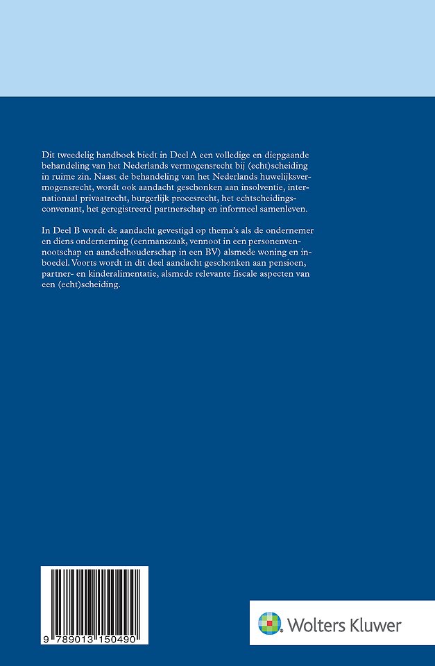 Dit tweedelig handboek biedt in het algemene Deel A een volledige behandeling van het Nederlands vermogensrecht bij (echt)scheiding, genomen in ruime zin. Ook de voorlopige voorzieningen, het echtscheidingsconvenant, het burgerlijk procesrecht, het belastingrecht en het internationaal privaatrecht genieten in Deel A gepaste aandacht.