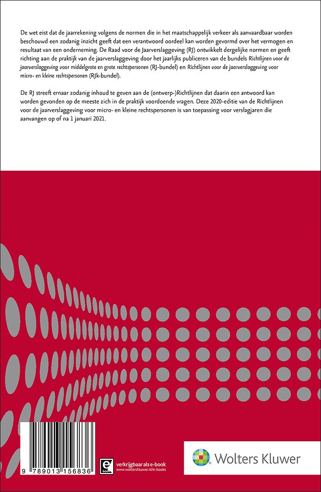 Voor het opmaken van de jaarrekening voor uw kleine onderneming is het van belang om te beschikken over de juiste kennis omtrent de opgestelde Richtlijnen waar u zich aan dient te houden. De jaarlijks terugkerende uitgave van Richtlijnen voor de jaarverslaggeving voor micro- en kleine rechtspersonen 2020, opgesteld door de Raad van Jaarverslaggeving, biedt u hierbij het noodzakelijke houvast. De bundel helpt u stapsgewijs om de jaarrekening in goede orde op te stellen.