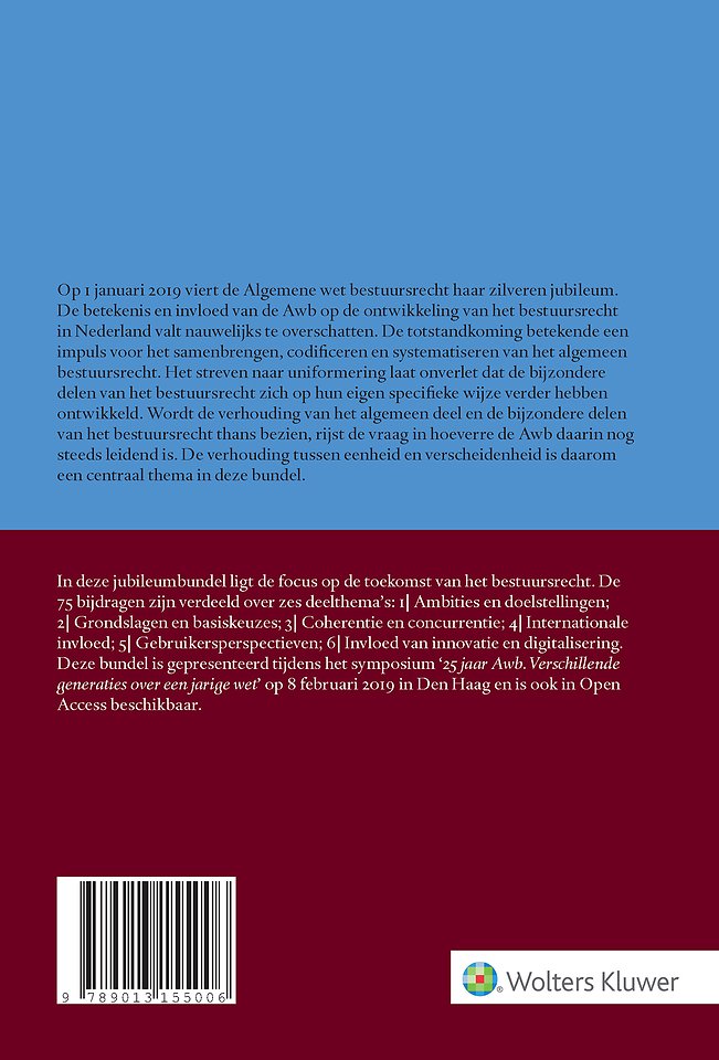 '25 jaar Awb, In eenheid en verscheidenheid' is een unieke bundel rondom het zilveren jubileum van de Awb: niet eerder waren zoveel auteurs bijeen om in 75 bijdragen over deze belangrijke systeemwet te schrijven. Die uitzonderlijke aandacht verbaast niet: de betekenis van de Awb op de ontwikkeling van het bestuursrecht in Nederland valt moeilijk te overschatten. Niet alleen is met de invoering van de Awb het algemeen deel van het bestuursrecht samengebracht en verder gecodificeerd, de invoering leidde ook tot een systematisering van belangrijke delen van het bestuursrecht. Bovendien werd eenheid in de rechtsgang naar de bestuursrechter gecreëerd. Het bestuursrecht werd in een klap een stuk volwassener. '25 jaar Awb' rechtvaardigt daarom alleszins een moment van viering en beschouwing en vormt een goede aanleiding voor bezinning op de plaats en functie van deze systeemwet, nu en voor de toekomst.