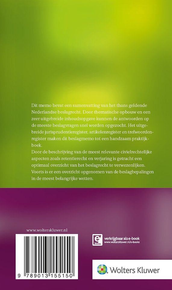 De auteur verheldert de meest relevante civielrechtelijke aspecten, zoals retentierecht en verjaring. Ook vindt u een overzicht van de beslagbepalingen in de meest belangrijke wetten. Het juridische kader wordt in dit memo verduidelijkt door de vele verwijzingen naar de wet. Dankzij de vele jurisprudentieverwijzingen worden de vragen vanuit uw eigen casus snel beantwoord. Zo kunt u een zaak snel kwalificeren, de daarbij behorende juridische vragen stellen en in de meeste gevallen het oordeel van de rechter daarop vernemen. U kunt duidelijk maken waarin uw zaak verschilt van die waarover reeds geoordeeld is. De thematische opbouw en overzichtelijke inhoudsopgave begeleiden u naar de juiste informatie.