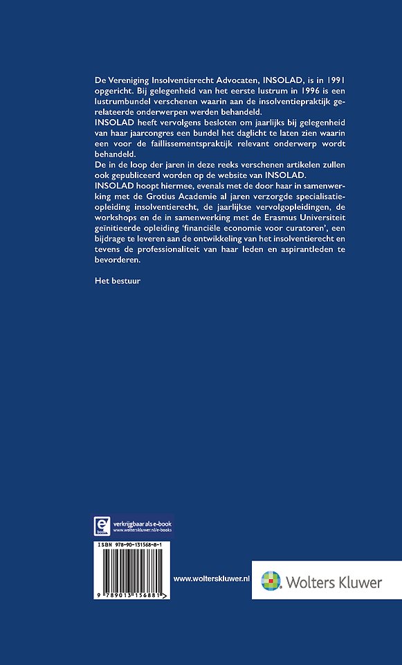 In deze editie uit de reeks wordt speciaal aandacht geschonken aan het faillissementsproces(recht). Het faillissementsprocesrecht ondergaat op dit moment een intensieve modernisatieslag, wat consequenties heeft voor het faillissementsproces (recht). De auteurs helpen u om deze gevolgen dieper te doorgronden. De Vereniging Insolventierecht Advocaten (INSOLAD) is in 1991 opgericht.