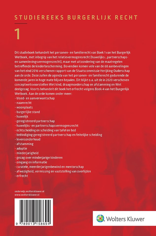 Een studieboek dat het familierecht in ruime zin inzichtelijk maakt. Je maakt hierin kennis met elk relevant deelgebied: personen- en familierecht, relatievermogensrecht en erfrecht. In deze 8e druk zijn tal van nieuwe wetten en rechterlijke uitspraken uit de periode 2018-2021 verwerkt.