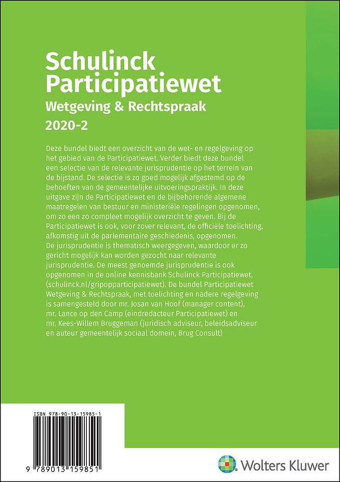 Wanneer u werkzaam bent bij een gemeente of als juridisch hulpverlener aan de bijstand, dan komt u mogelijk in aanraking met de Participatiewet. Schulinck Participatiewet Wetgeving & Rechtspraak 2020-2 vormt in die situaties het ideale naslagwerk. U vindt in deze bundel een compleet overzicht van wetgeving, toelichting en nadere regelgeving omtrent de Participatiewet, bijgewerkt tot en met 1 juli 2020. De relevante rechtspraak is thematisch voor u gesorteerd. Zo heeft u in uw dagelijkse werkzaamheden de actuele stand van zaken omtrent de Participatiewet altijd binnen handbereik.
