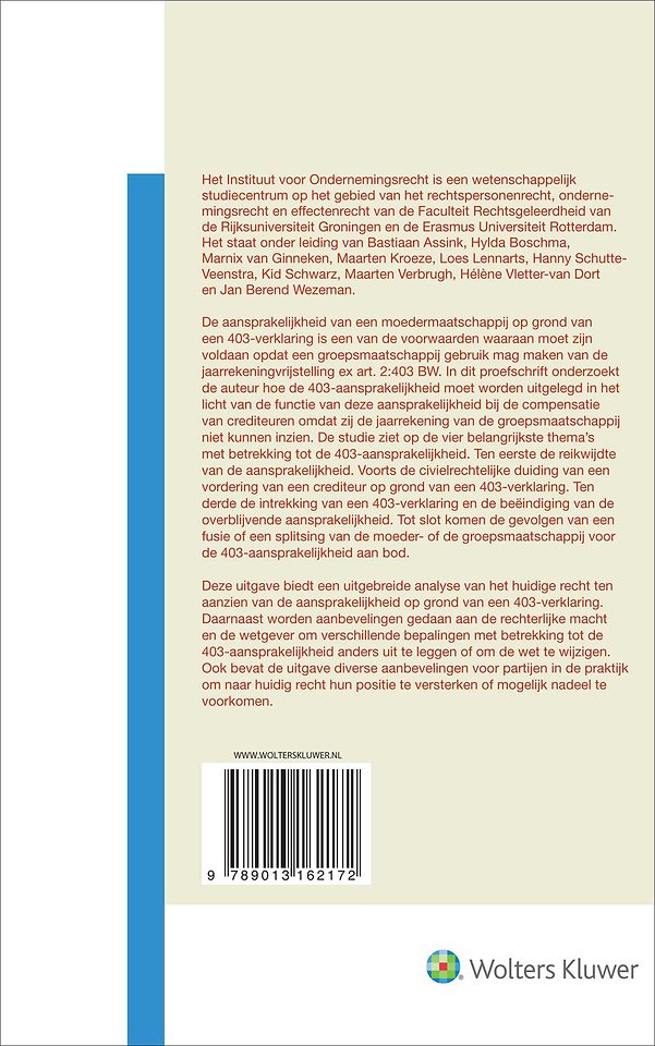 De auteur schetst een totaalbeeld van de 403-aansprakelijkheid van een moedermaatschappij bezien vanuit de functie van deze aansprakelijkheid bij de compensatie van crediteuren. Dit leidt tot een geïntegreerde uitleg van de verschillende onderwerpen met betrekking tot de 403-aansprakelijkheid, en de onderlinge wisselwerking daartussen.