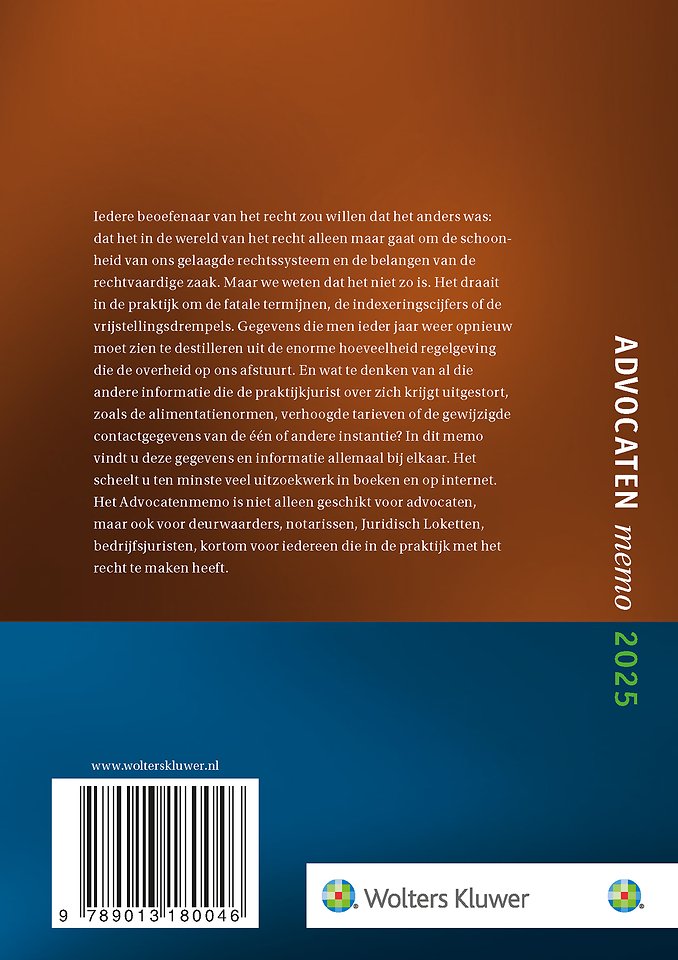 Advocatenmemo 2025 is van grote waarde voor iedereen die in de praktijk te maken heeft met het recht. Denk hierbij niet alleen aan advocaten, maar ook aan notarissen, gerechtsdeurwaarders, medewerkers van het Juridisch Loket of bedrijfsjuristen.