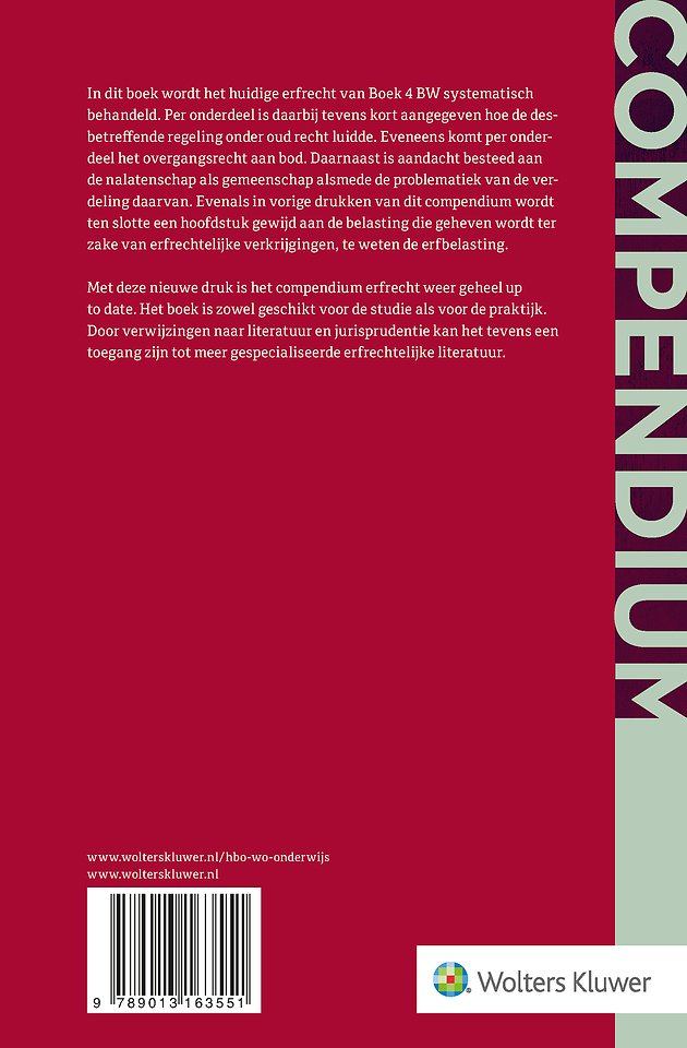 Met deze nieuwe druk is het compendium erfrecht weer geheel up to date. De titel is zowel geschikt voor de studie als voor de praktijk. Door verwijzingen naar literatuur en jurisprudentie dient deze titel ook als toegang tot meer gespecialiseerde erfrechtelijke literatuur.