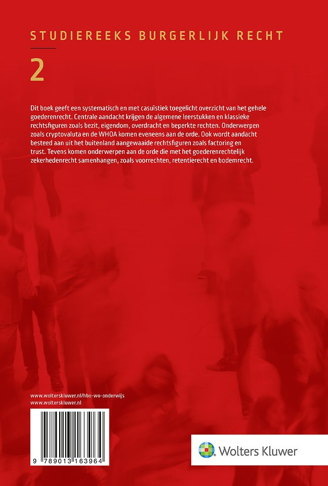 Deze titel geeft een systematisch én casuïstisch toegelicht overzicht van het gehele goederenrecht. Centrale aandacht gaat uit naar de algemene leerstukken en klassieke rechtsfiguren zoals bezit, eigendom, overdracht en beperkte rechten. Ook onderwerpen zoals cryptovaluta en de WHOA komen aan de orde, evenals uit het buitenland aangewaaide rechtsfiguren zoals factoring en trust.