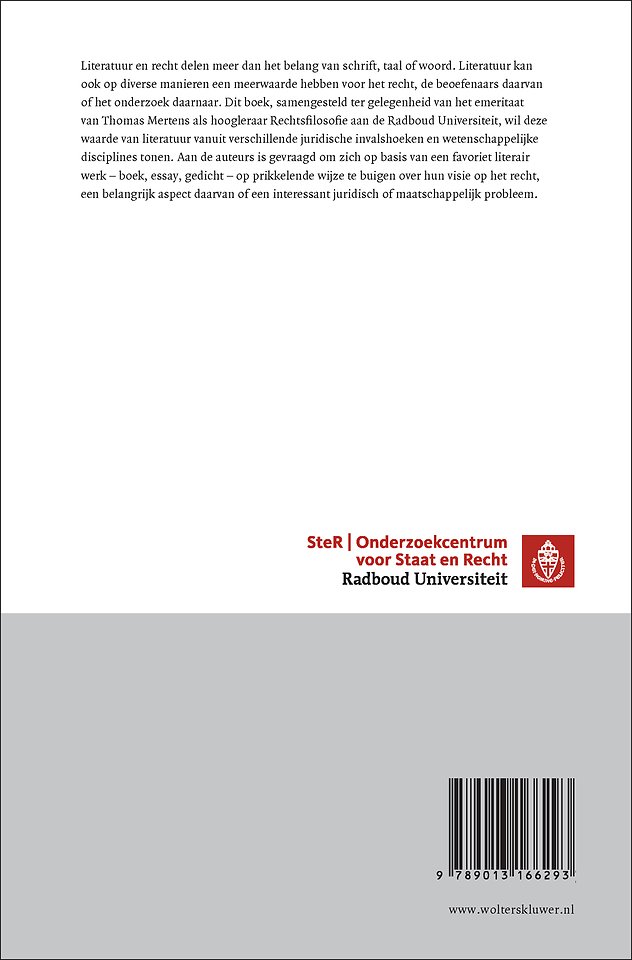 Literatuur en recht delen meer dan het belang van schrift, taal of woord. Literatuur kan ook op diverse manieren een meerwaarde hebben voor het recht, de beoefenaars daarvan of het onderzoek daarnaar. Literatuur en recht Liber amicorum voor prof. dr. T.J.M. Mertens toont deze waarde van literatuur vanuit verschillende juridische invalshoeken en wetenschappelijke disciplines. Aan de auteurs is gevraagd om zich op basis van een favoriet literair werk op prikkelende wijze te buigen over hun visie op het recht, een belangrijk aspect daarvan of een interessant juridisch of maatschappelijk probleem. De titel bevat toegankelijke teksten en is interdisciplinair omdat zowel recht als wijsbegeerte aan bod komen. Dit liber amicorum is samengesteld ter gelegenheid van het emeritaat van Thomas Mertens als hoogleraar Rechtsfilosofie aan de Radboud Universiteit.