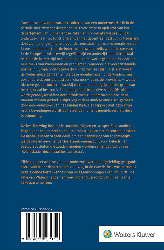 Hoe kunnen de klemmende problemen in het decentraal bestuur in Nederland worden opgelost? In deze publicatie wordt geanalyseerd hoe bepaalde problemen binnen gemeenten zijn ontstaan en moeten worden geduid. De titel geeft 7 kernaanbevelingen en 70 specifieke aanbevelingen om het decentraal bestuur in ons land te verbeteren en te revitaliseren.