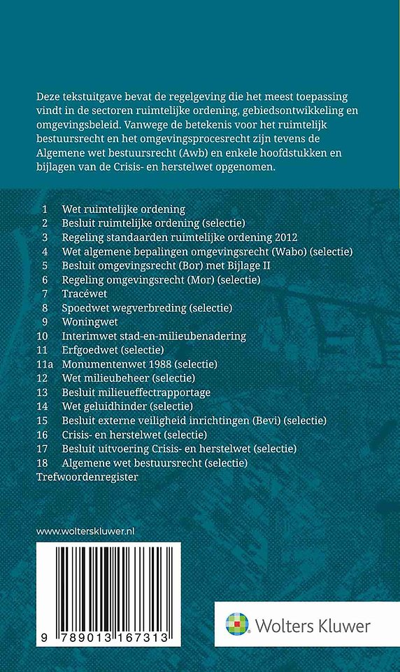 De uitgave bevat de tekst van de nu geldende regelgeving, waarin de meest recente wijzigingen zijn verwerkt. Ook de Crisis- en herstelwet en het Besluit uitvoering Crisis- en herstelwet, die anticiperen op de komende Omgevingswet, zijn opgenomen. Om de omvang van de uitgave handzaam en overzichtelijk te houden, is van sommige wetten of regelingen een aantal artikelen of bijlagen doelbewust niet opgenomen.