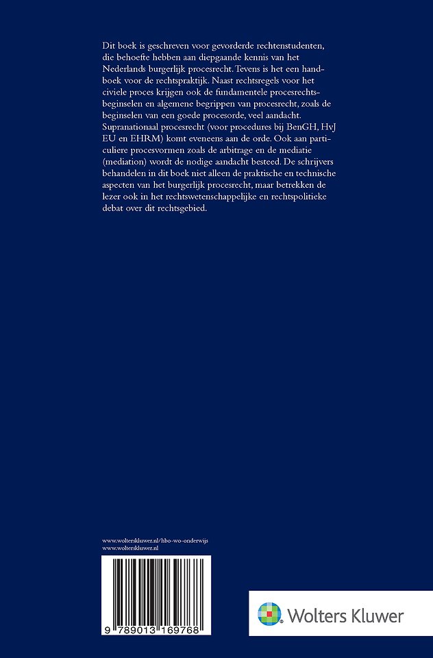 Dit handboek geeft een grondig en verdiepend overzicht van het burgerlijk procesrecht, dat voor zowel onderwijs-, praktijk- als wetenschapsdoeleinden gebruikt kan worden. Alle rechtsregels voor het civiele proces komen aan de orde. Daarnaast krijgen ook de fundamentele procesrechtsbeginselen en algemene begrippen van procesrecht veel aandacht, zoals de beginselen van een goede procesorde.