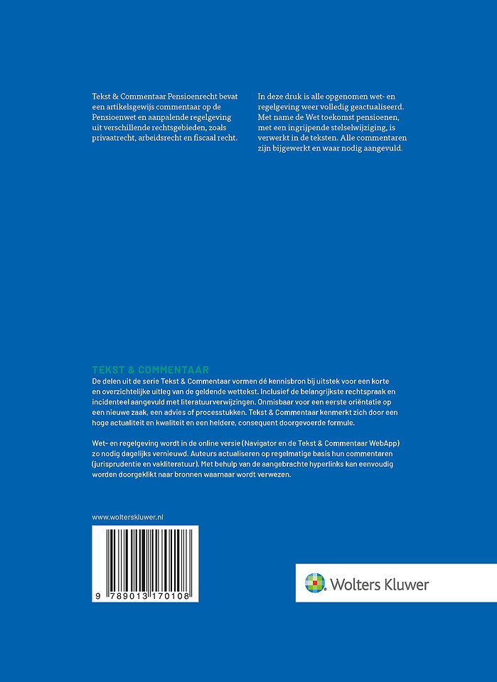 Tekst & Commentaar Pensioenrecht vormt dé kennisbron bij uitstek voor een korte en overzichtelijke uitleg van de geldende wettekst. Inclusief de belangrijkste rechtspraak en waar nodig aangevuld met literatuurverwijzingen. Onmisbaar voor een eerste oriëntatie op een nieuwe zaak, een advies of processtukken. Gebruikers waarderen de serie vanwege de betrouwbaarheid en actualiteit.