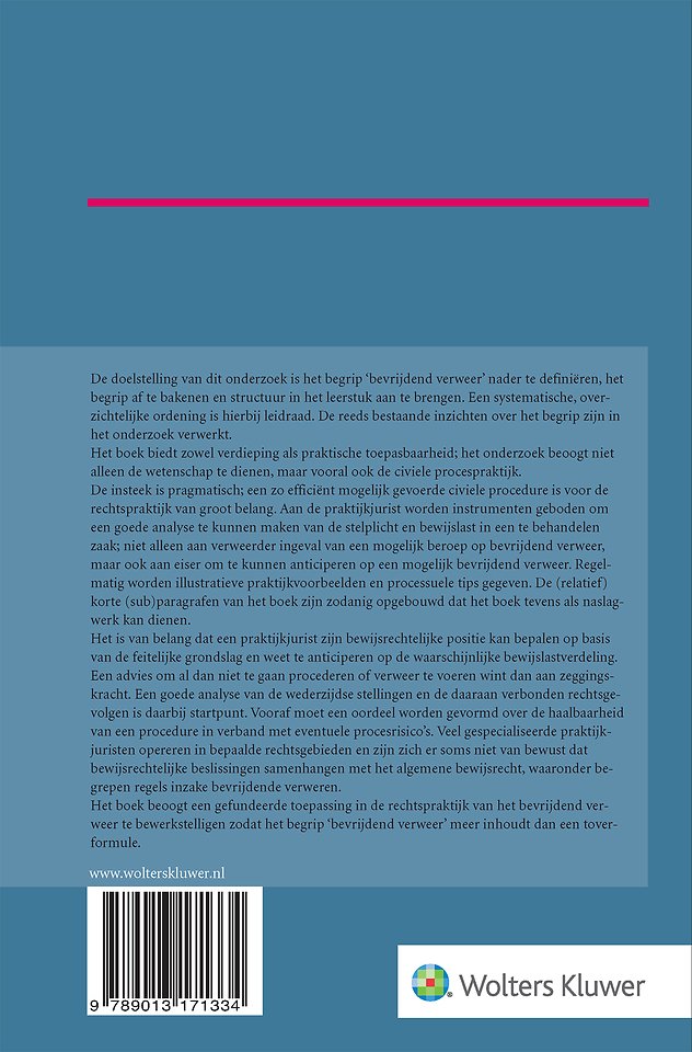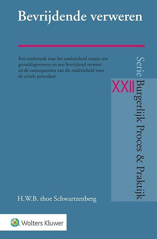 Bevrijdende verweren biedt heldere en complete uitleg over het begrip bevrijdend verweer. De doelstelling van deze titel is om dit begrip nader te definiëren, af te bakenen en structuur in het leerstuk aan te brengen. Een systematische, overzichtelijke ordening is hierbij leidraad, waarbij ook bestaande inzichten over het begrip in het onderzoek verwerkt zijn.